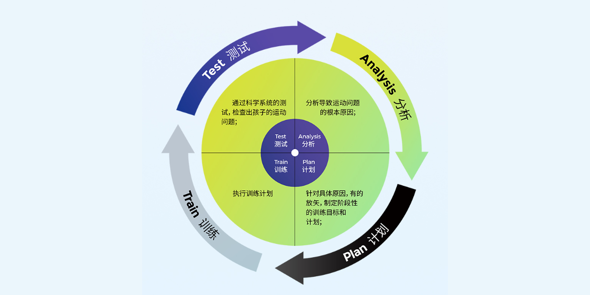 夺冠体育与北京体育大学联合开发的,基于发现问题、解决问题的体育学科方法论,是针对青少年运动能力提升的运动学理论。在实际应用中,首先通过特定的方法或通过智能硬件对训练者的运动表现进行系统性的测试与记录,查找出训练者具体的未达标运动能力参数。针对未达标项进行深度分析,挖掘出限制训练者运动能力的具体原因。针对具体原因给出相应具体的、周期性的训练处方。训练一个周期后,再进行阶段性的测试,并根据测试、分析结果对原训练计划做出相应的调整,直至训练者运动能力达到满分水平。进而实现循序渐进,稳步提升。